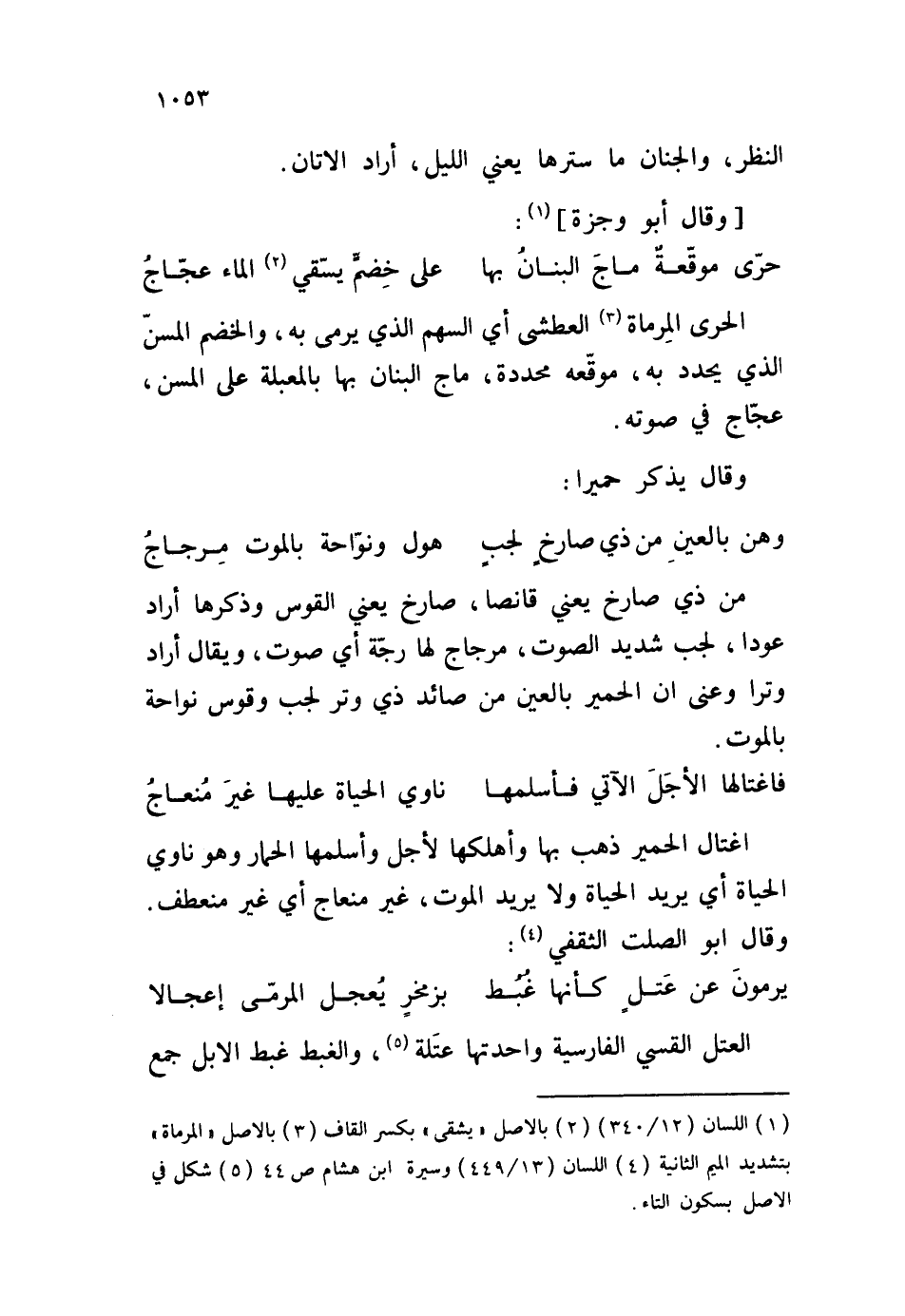 الحرى المِرماة العطشى أي السهم الذي يرمى به، والخضم المسنّ الذي يحدد به، موقّعه محددة، ماج البنان بها بالمعبلة على المسن، عجّاج في صوته. وقال يذكر حميرا: