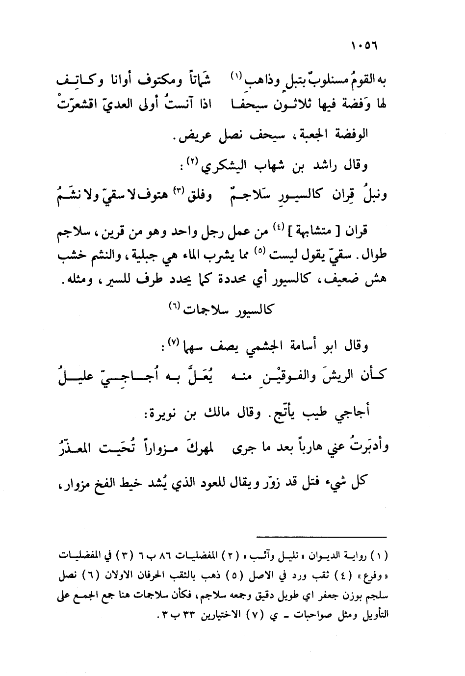 قران متشابهة من عمل رجل واحد وهو من قرين، سلاجم طوال. سقيّ يقول ليست مما يشرب الماء هي جبلية، والنشم خشب هش ضعيف، كالسيور أي محددة كما يحدد طرف للسير، ومثله. كالسيور سلاجمات وقال أبو أسامة الجشمي يصف سهما: