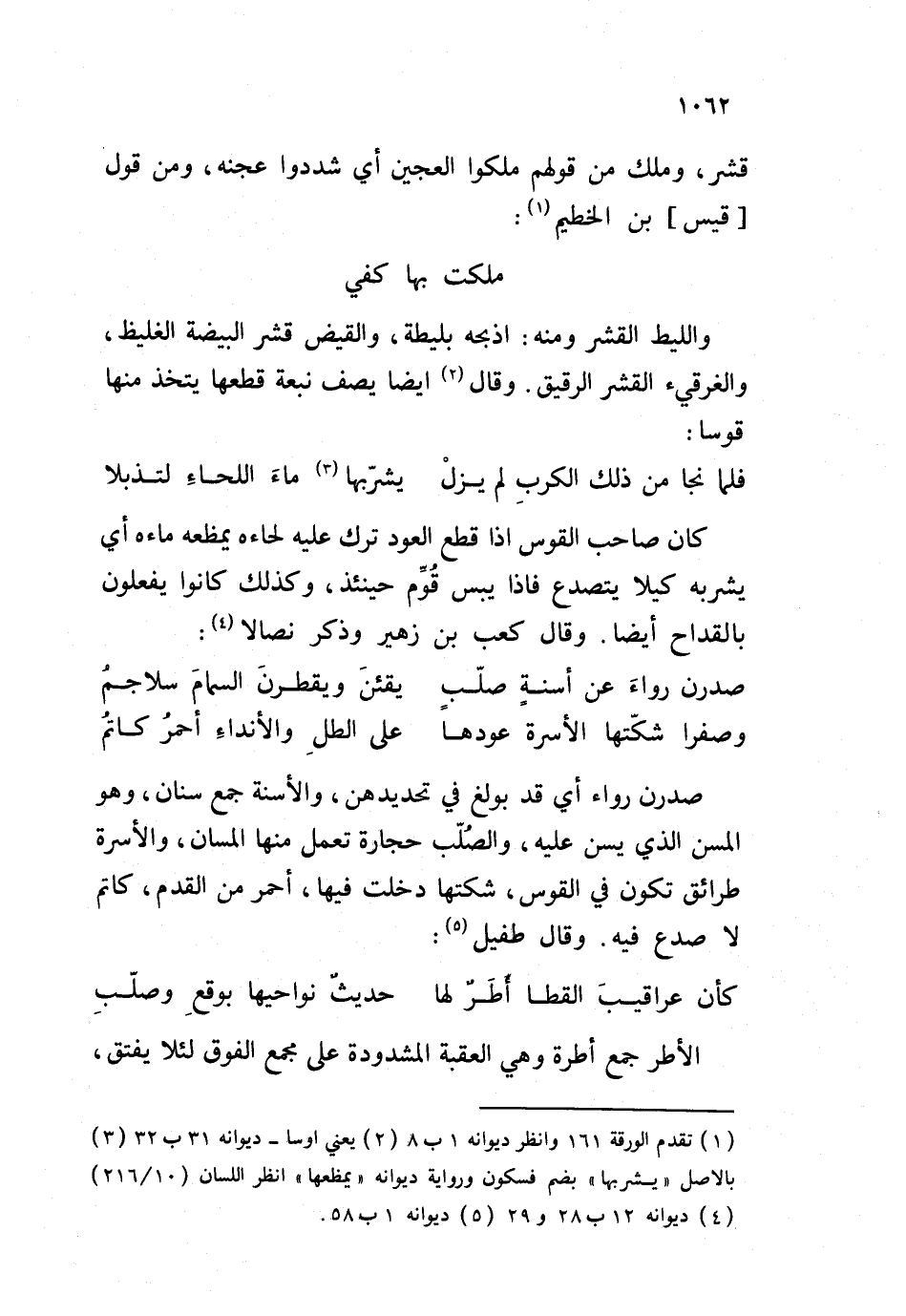 صدرن رواء أي قد بولغ في تحديدهن، والأسنة جمع سنان، وهو المسن الذي يسن عليه، والصُلّب حجارة تعمل منها المسان، والأسرة طرائق تكون في القوس، شكتها دخلت فيها، أحمر من القدم، كاتم لا صدع فيه. وقال طفيل: