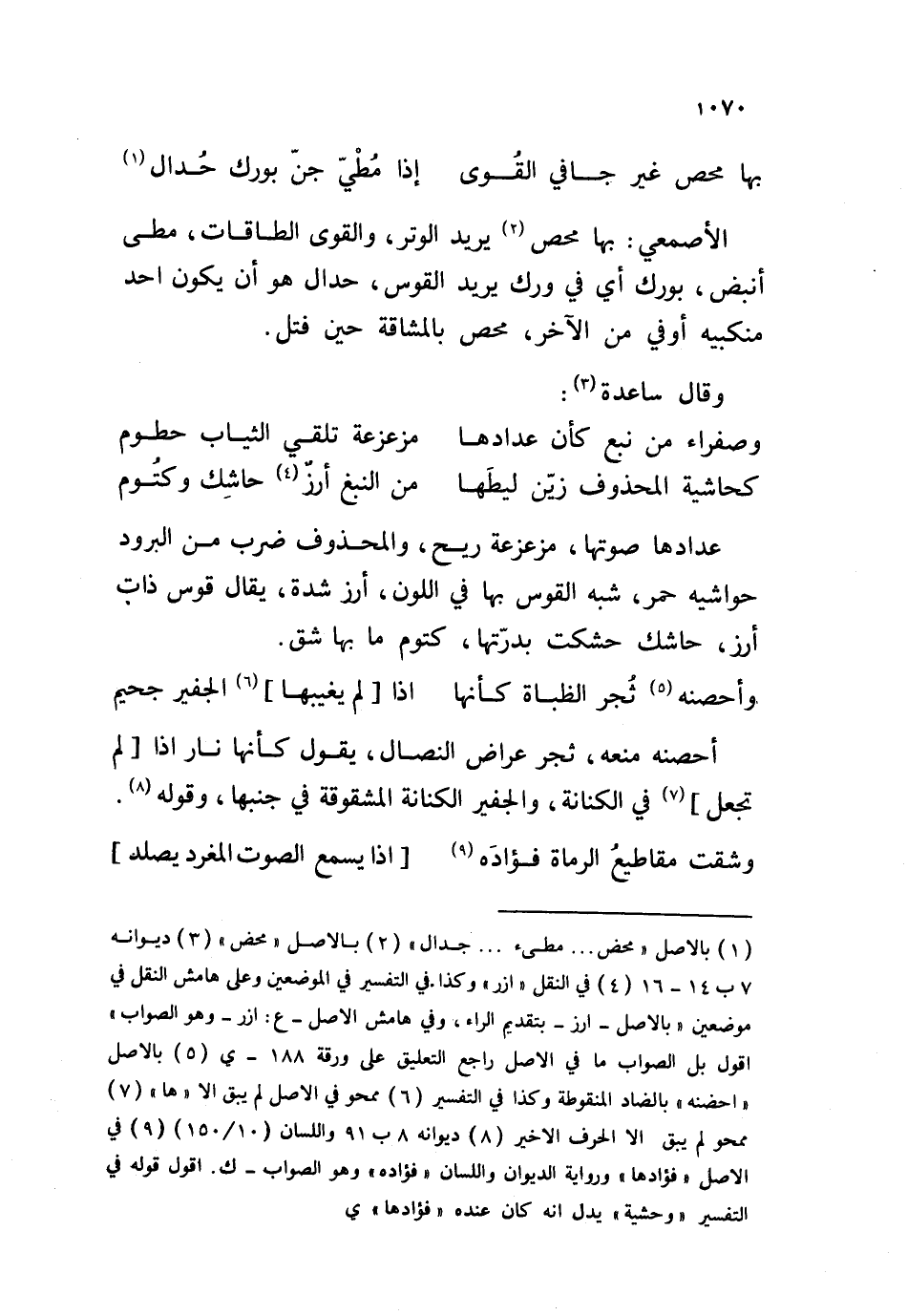الأصمعي: بها محص يريد الوتر، والقوى الطاقات، مطى أنبض، بورك أي في ورك يريد القوس، حدال هو أن يكون أحد منكبيه أوفي من الآخر، محص بالمشاقة حين فتل.
