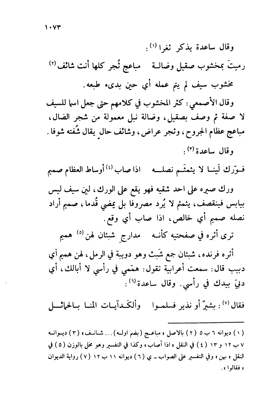 مخشوب سيف لم يتم عمله أي حين بدىء طبعه. وقال الأصمعي: كثر المخشوب في كلامهم حتى جعل اسما للسِيف لا صفة ثم وصف بصقيل، وضالة نبل معمولة من شجر الضال، مباعج عظام الجروح، وثجر عراض، وشائف حالٍ يقال شفته شوفا. وقال ساعدة: