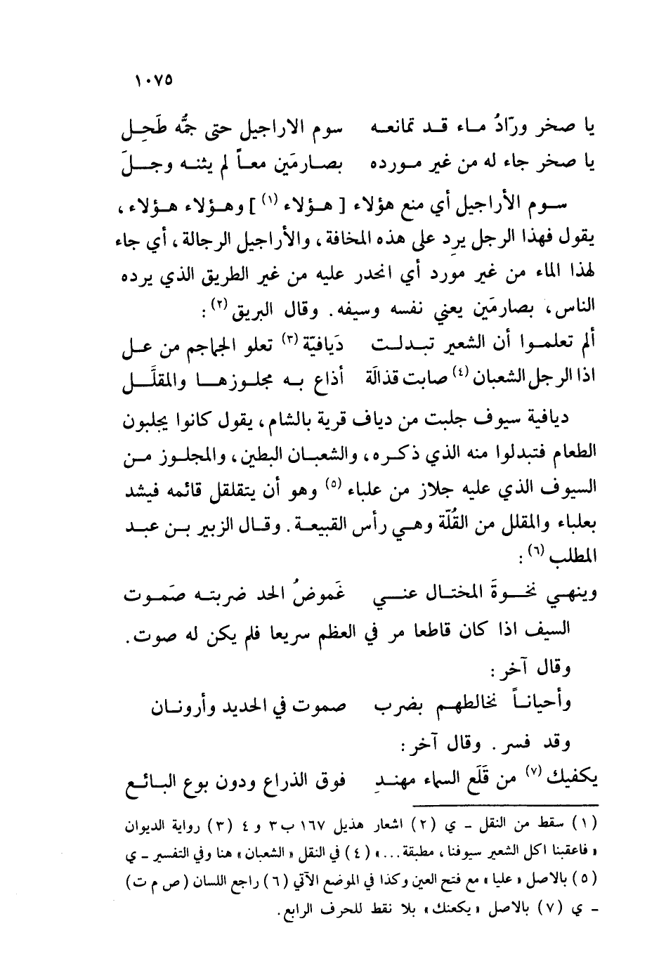 سوم الأراجيل أي منع هؤلاء هؤلاء، وهؤلاء هؤلاء، يقول فهذا الرجل يرِد على هذه المخافة، والأراجيل الرجالة، أي جاء لهذا الماء من غير مورد أي انحدر عليه من غير الطريق الذي يرَده الناس، بصارمَين يعني نفسه وسيفه. وقال البريق: