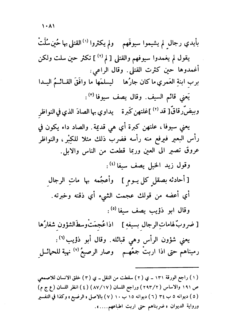 يعني سيوفا، علتهن كبرة أي هي قديمة. والصاد داء يكون في رأس البعير فيرفع منه رأسه فضرب ذلك مثلا للكِبْر، والنواظر عروق تصير إلى العين وربما قطعت من الناس والإبل. وقول زيد الخيل يصف سيفا: