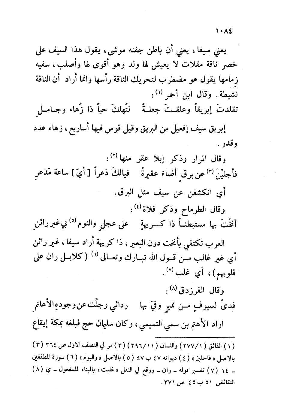 يعني سيفا، يعني أن باطن جفنه موشى، يقول هذا السيف على خصر ناقة مقلات لا يعيش لها ولد وهو أقوى لها وأصلب، سفيه زِمامها يقول هو مضطرب لتحريك الناقة رأسها وإنما أراد أن الناقة نشيطة. وقال ابن أحمر:
