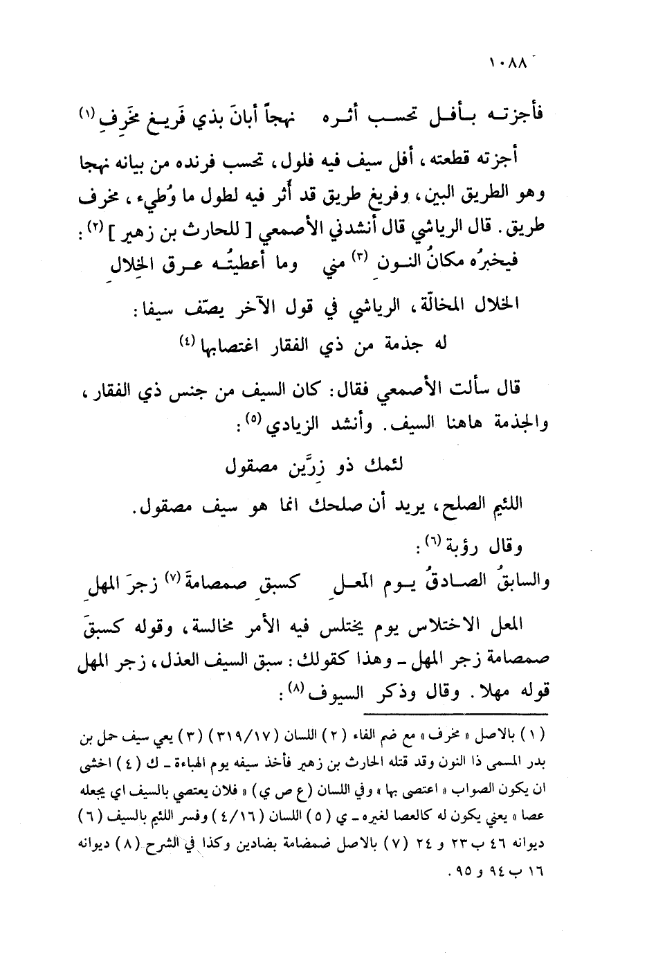 أجزته قطعته، أفل سيف فيه فلول، تحسب فرنده من بيانه نهجا وهو الطريق البين، وفريغ طريق قد أثر فيه لطول ما وطيء، مخرف طريق. قال الرياشي قال أنشدني الأصمعي للحارث بن زهير: