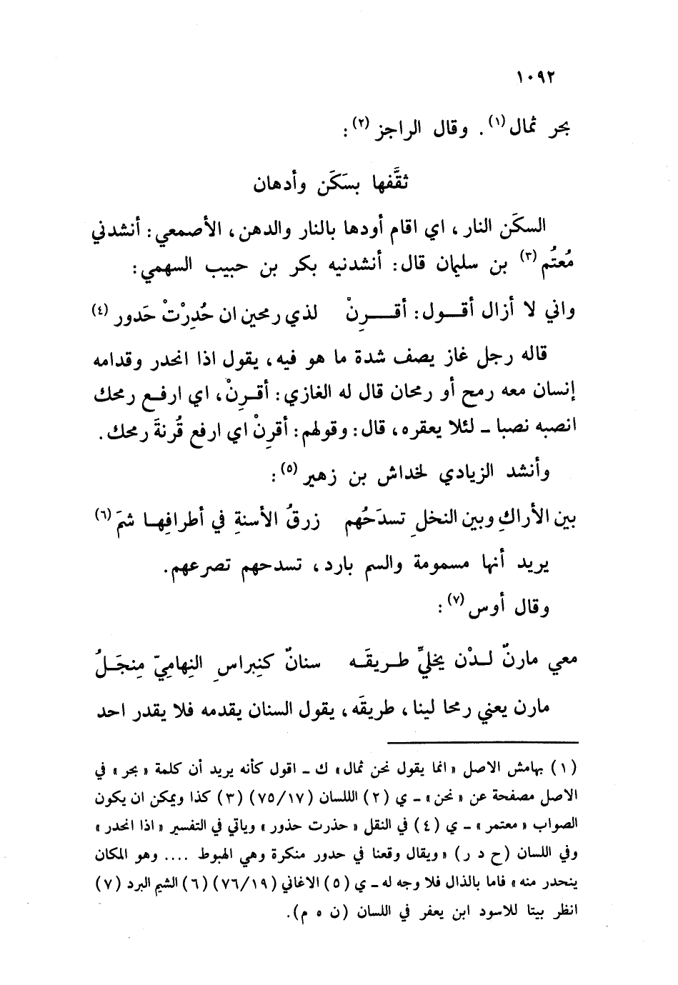 بحر ثمال. وقال الراجز: ثفّفها بسَكَن وأدهان السكن النار، أي أقام أودها بالنار والدهن، الأصمعي: أنشدني مُعتُم بن سليمان قال: أنشدنيه بكر بن حبيب السهمي: