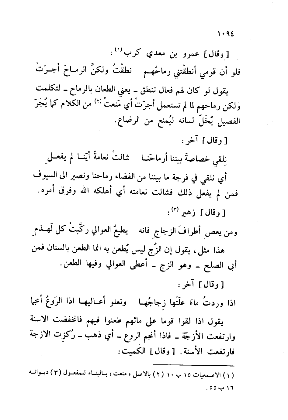 فلو أن قومي أنطقْتني رماحُهم ... نطقْتُ ولكنَّ الرماحَ أجرّتْ