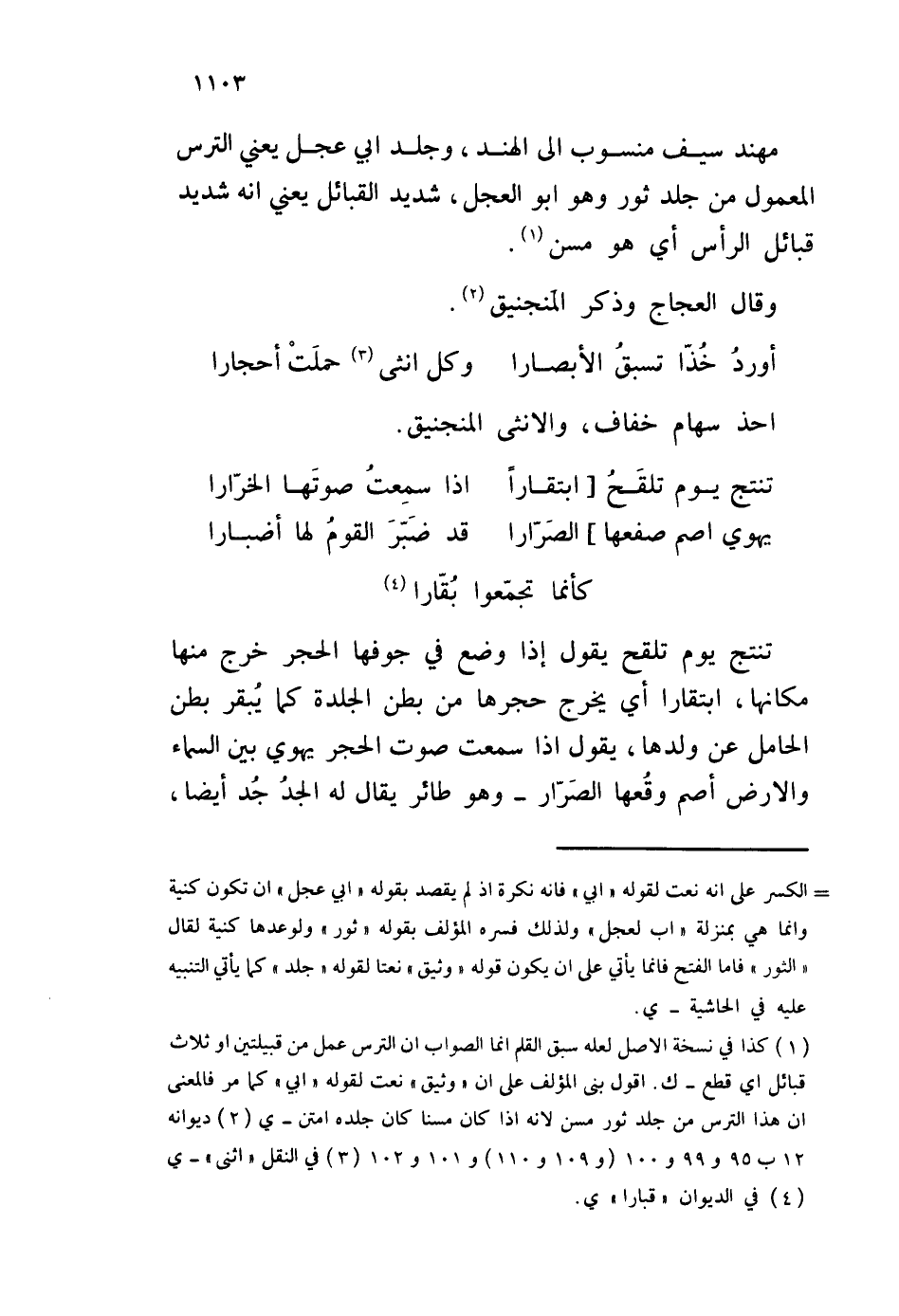 مهند سيف منسوب إلى الهند، وجلد أبي عجل يعني الترس المعمول من جلد ثور وهو أبو العجل، شديد القبائل يعني أنه شديد قبائل الرأس أي هو مسن. وقال العجاج وذكر المنجنيق.
