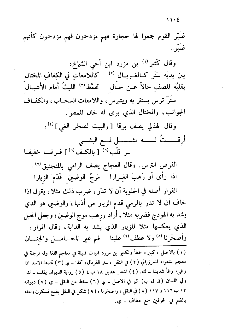 ستَر ترس يستتر به ويتبرس، واللامعات السحاب، والكفاف الجوانب، والمختال الذي يرى له خال للمطر. وقال الهذلي يصف برقا والبيت لصخر الغي: