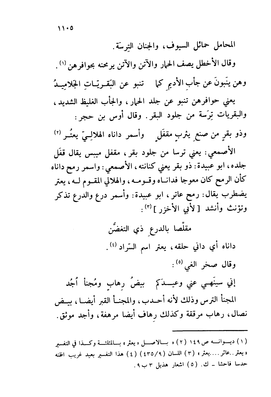 الأصمعي: يعني ترسا من جلود بقر، مقفل ميبس يقال قفَل جلده، أبو عبيدة: ذو بقر يعني كنانته، الأصمعي: واسمر رمح داناه كأن الرمح كان معوجا فداناه وقومه، والهلالي المقوم له، يعتر يضطرب يقال: رمح عاتر، أبو عبيدة: وأسمر درع والدرع تذكر وتؤنث وأنشد لأبي الأخزر: