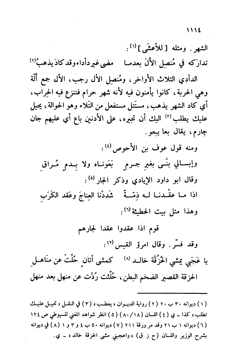 الدآدي الثلاث الأواخر، ومنصِل الأل رجب، الأل جمع آلة وهي الحربة، كانوا يأمنون فيه لأنه شهر حرام فتنزع فيهِ الحِراب، أي كاد الشهر يذهب، مستَتل مستفعل من التلاء وهو الحوالة، يحيل عليك يطلب إليك أن تجيره، على الأدنين باع أي عليهم جان جارم، يقال بعا يبعو. ومنه قول عوف بن الأحوص: