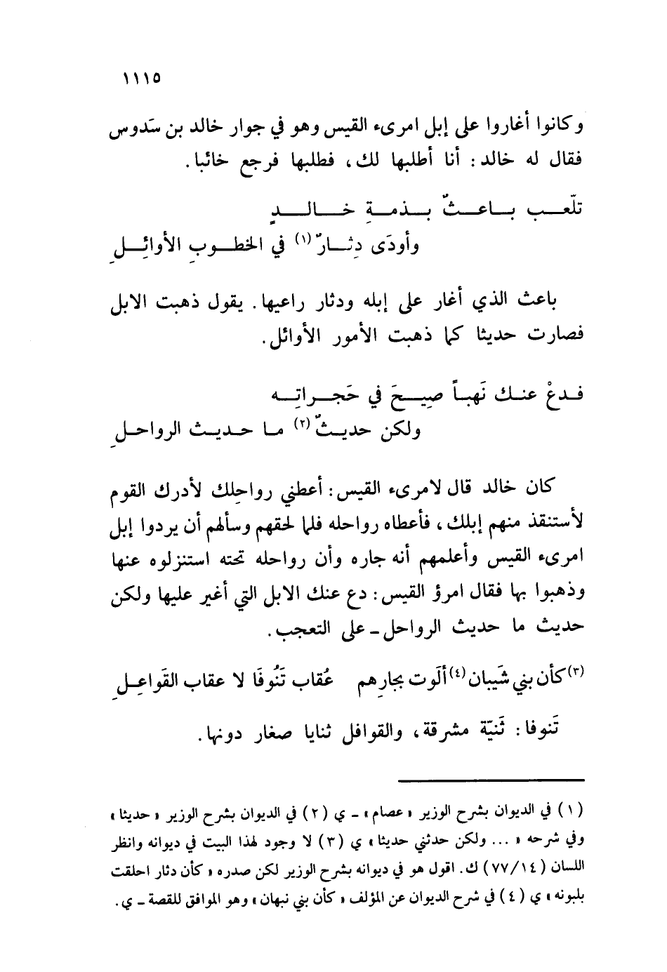 وكانوا أغاروا على إبل امرىء القيس وهو في جوار خالد بن سدوس فقال له خالد: أنا أطلبها لك، فطلبها فرجع خائبا.