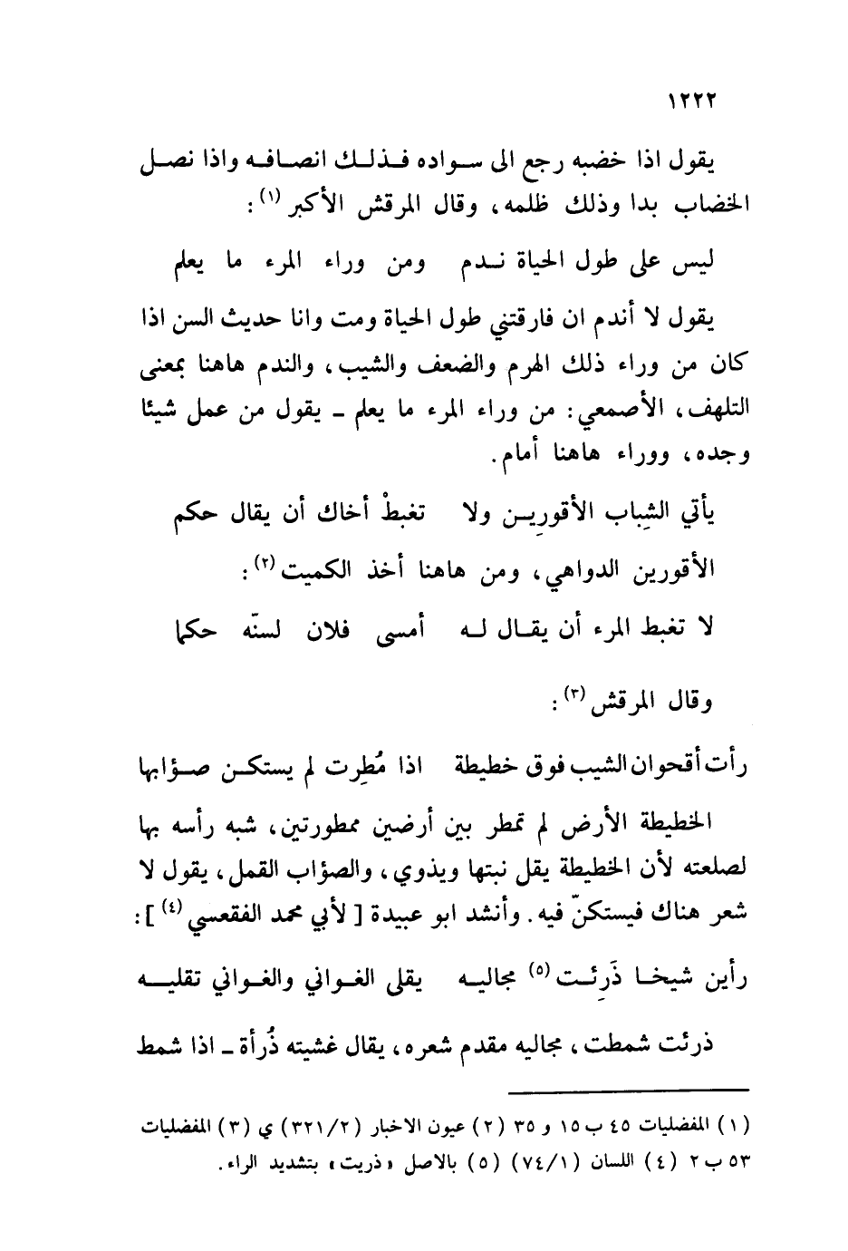 يقول إذا خضبه رجع إلى سواده فذلك انصافه وإذا نصل الخضاب بدا وذلك ظلمه، وقال المرقش الأكبر: