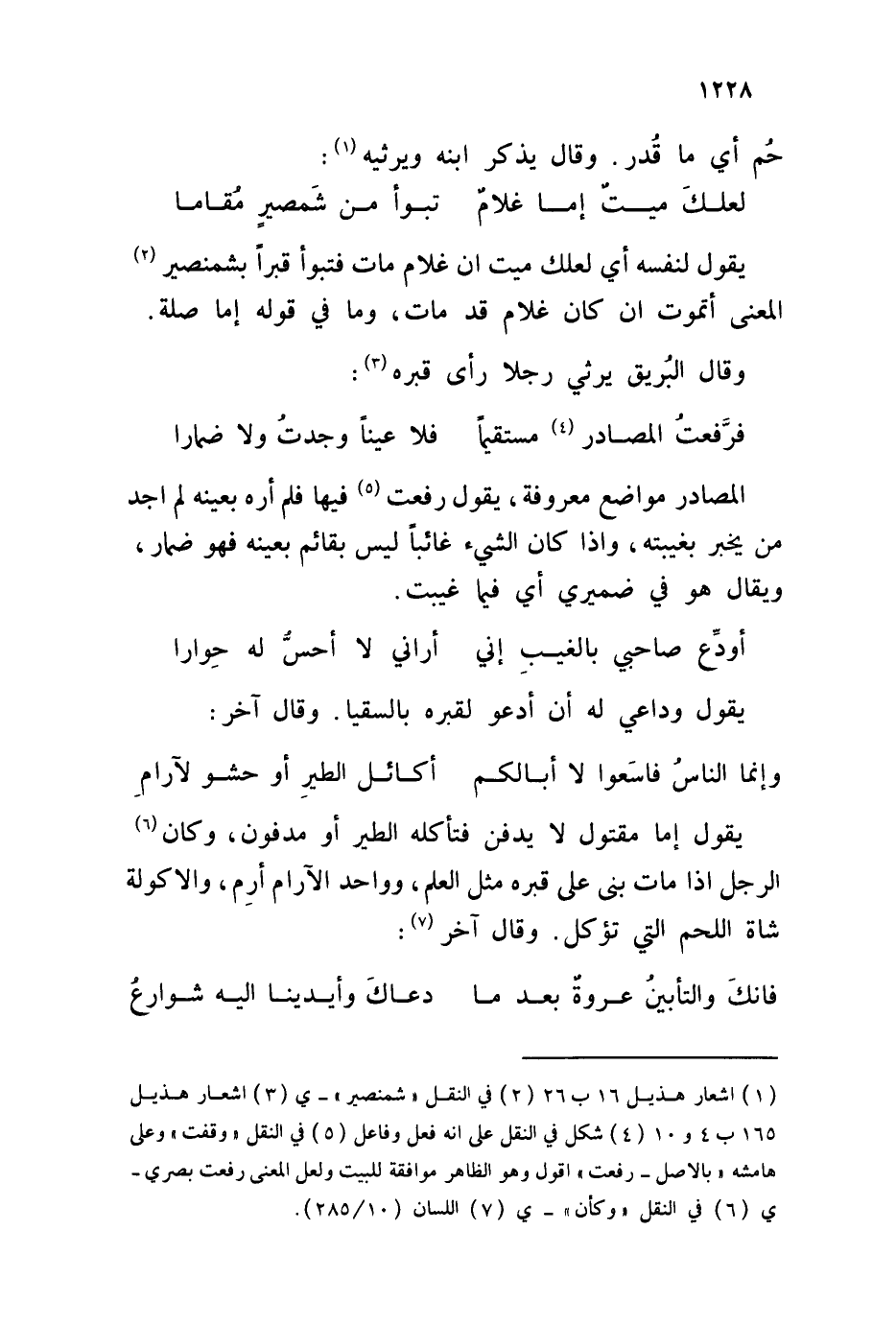 يقول إما مقتول لا يدفن فتأكله الطير أو مدفون، وكان الرجل إذا مات بنى على قبره مثل العلم، وواحد الآرام أرم، والأكولة شاة اللحم التي تؤكل. وقال آخر: