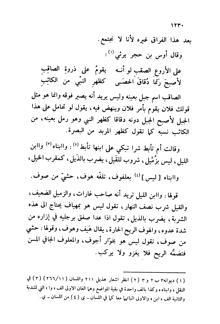 قولها: وا ابن الليل تريد أنه صاحب غارات، والزميل الضعيف، والقيل شرب نصف النهار، تقول ليس هو بمهياف يحتاج إلى هذه الشربة، يضرب بالذيل، تقول إذا عدا صفق برجليه في إزاره من شدة عدوه، والهوف الريح الحارة، يقال هيف وهوف، وقولها: حشي من صوف، تقول ليس هو بخوار أجوف، والمعلوف الجافي المسن فتضمه الريح فلا يغزو ولا يركب.