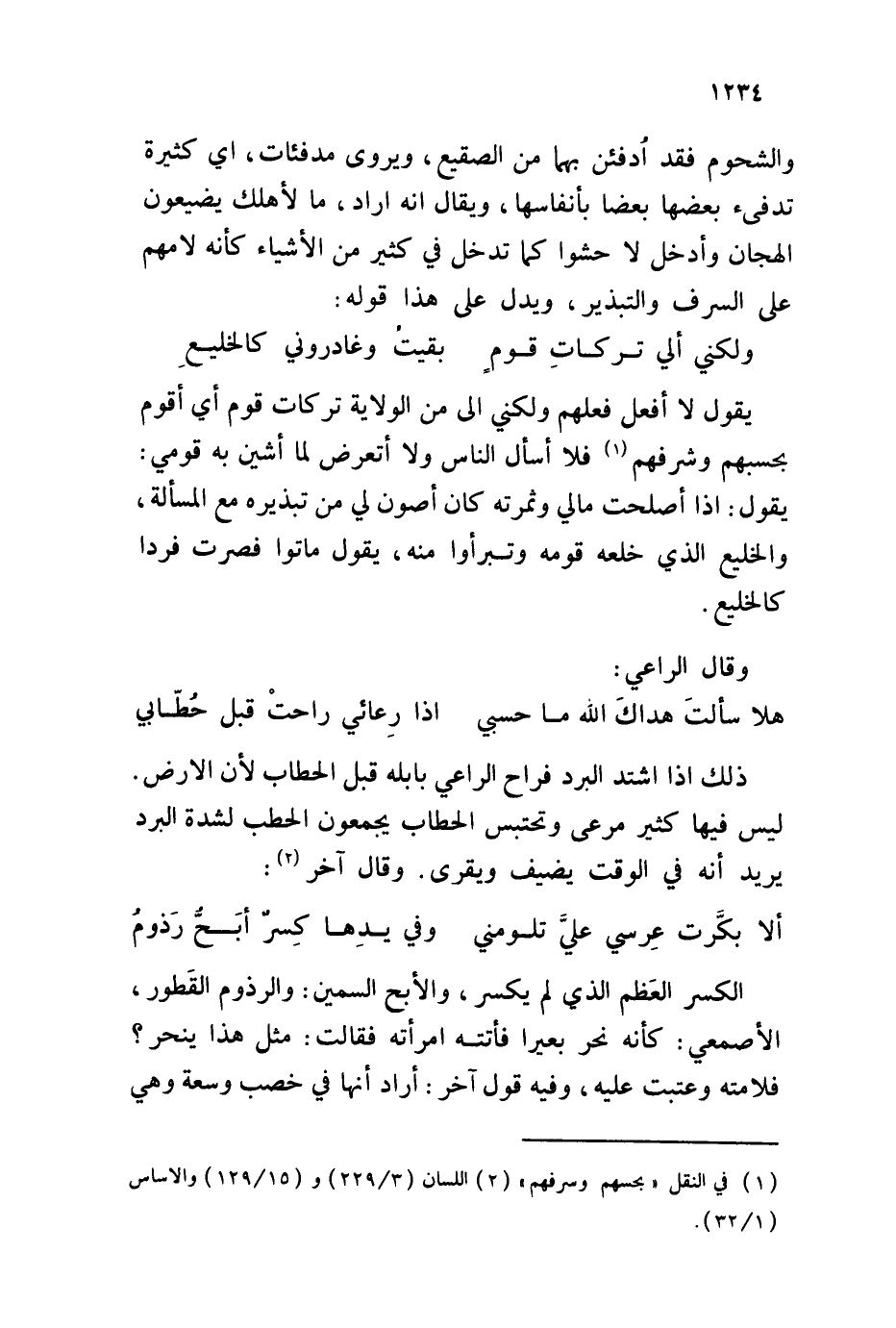 والشحوم فقد أدفئن بهما من الصقيع، ويروى مدفئات، أي كثيرة تدفئ بعضها بعضاً بأنفاسها، ويقال إنه أراد، ما لأهلك يضيعون الهجان وأدخل لا حشواً كما تدخل في كثير من الأشياء كأنه لامهم على السرف والتبذير، ويدل على هذا قوله: