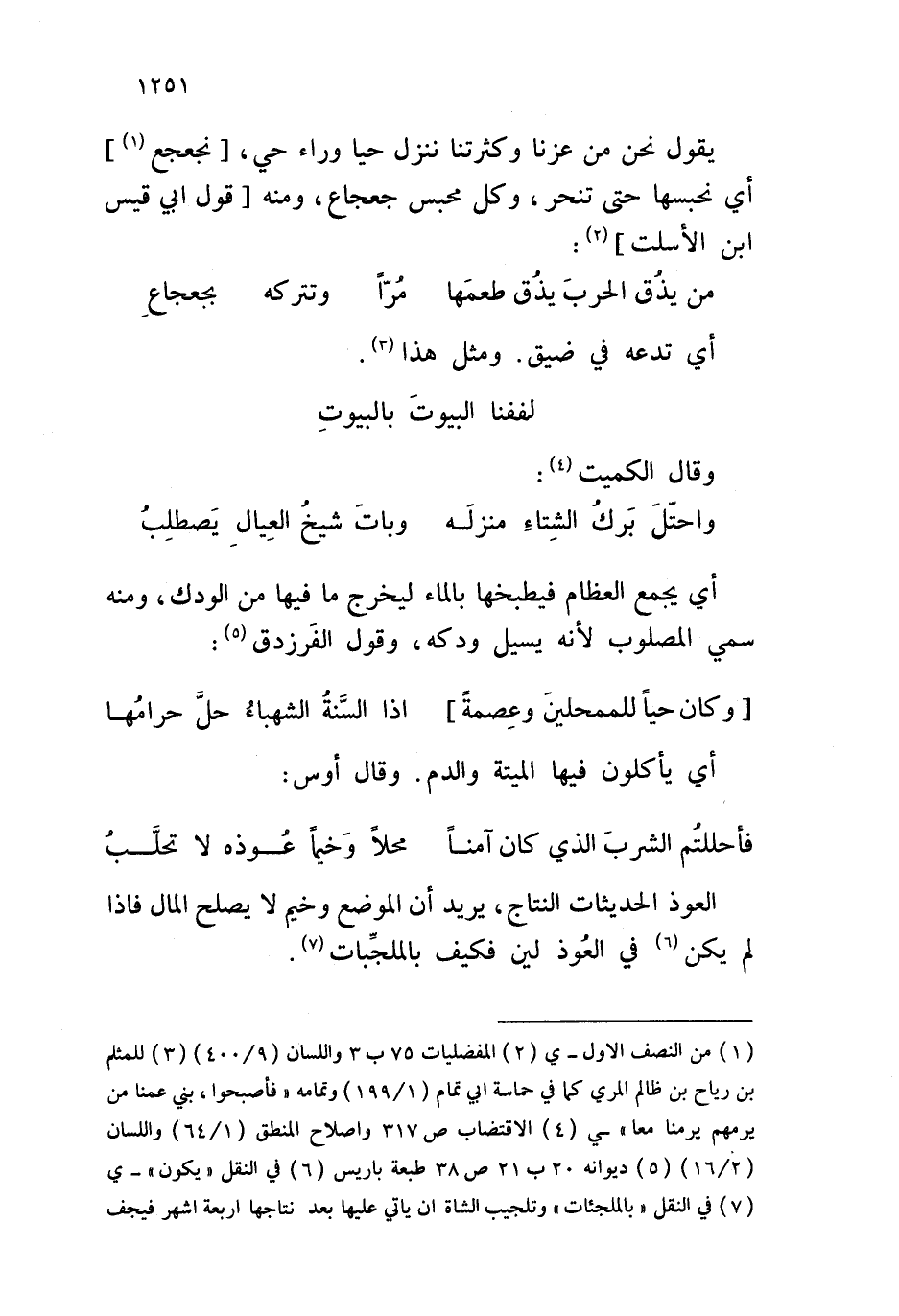 يقول نحن من عزنا وكثرتنا ننزل حياً وراء حي، نجعجع أي نحبسها حتى تنحر، وكل محبس جعجاع، ومنه قول أبي قيس ابن الأسلت: