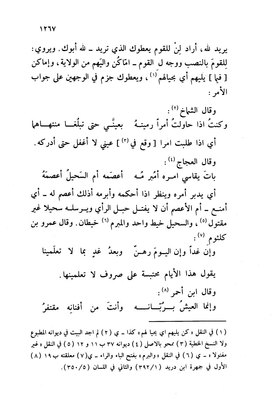 أي يدبر أمره وينظر إذا أحكمه وأبرمه أذلك أعصم له - أي أمنع - أم الأعصم أن لا يفتل حبل الرأي ويرسله سحيلاً غير مقتول، والسحيل خيط واحد والمبرم خيطان. وقال عمرو بن كلثوم: