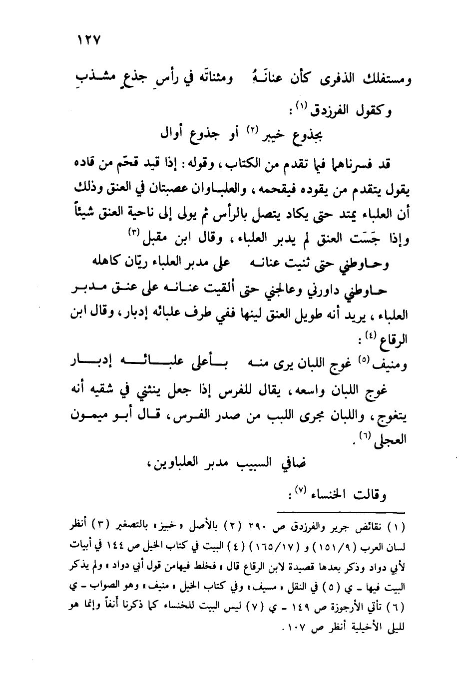 حاوطني داورني وعالجني حتى ألقيت عنانه على عنق مدبر العلباء، يريد أنه طويل العنق لينها ففي طرف علبائه إدبار، وقال ابن الرقاع: