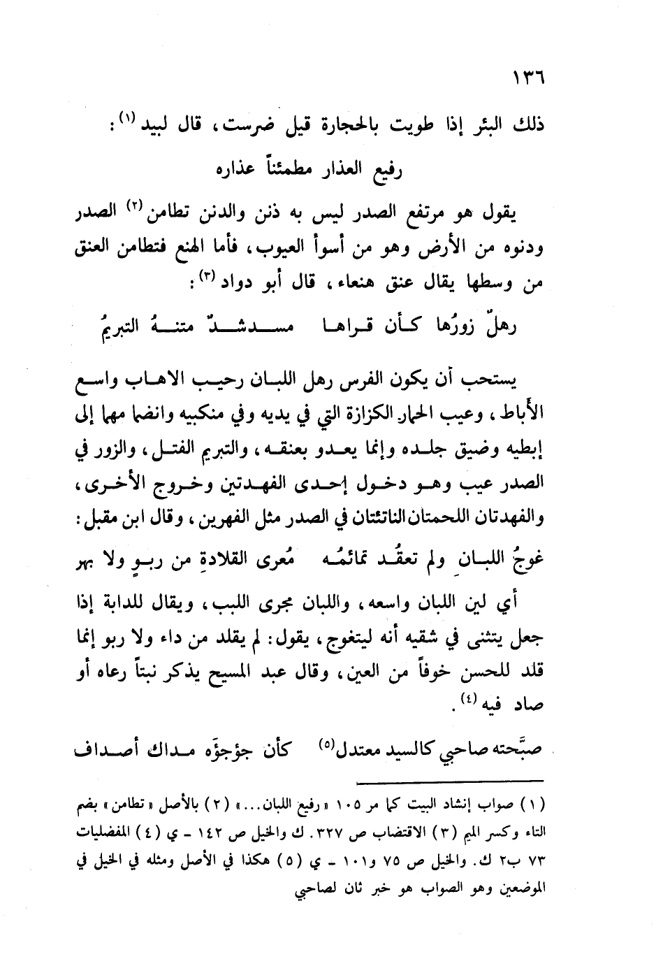 يستحب أن يكون الفرس رهل اللبان رحيب الاهاب واسع الأباط، وعيب الحمار الكزازة في يديه وفي منكبيه وانضما مهما إلى إبطيه وضيق جلده وإنما يعدو بعنقه، والتبريم الفتل، والزور في الصدر عيب وهو دخول إحدى الفهدتين وخروج الأخرى، والفهدتان اللحمتان الناتئتان في الصدر مثل الفهرين، وقال ابن مقبل: