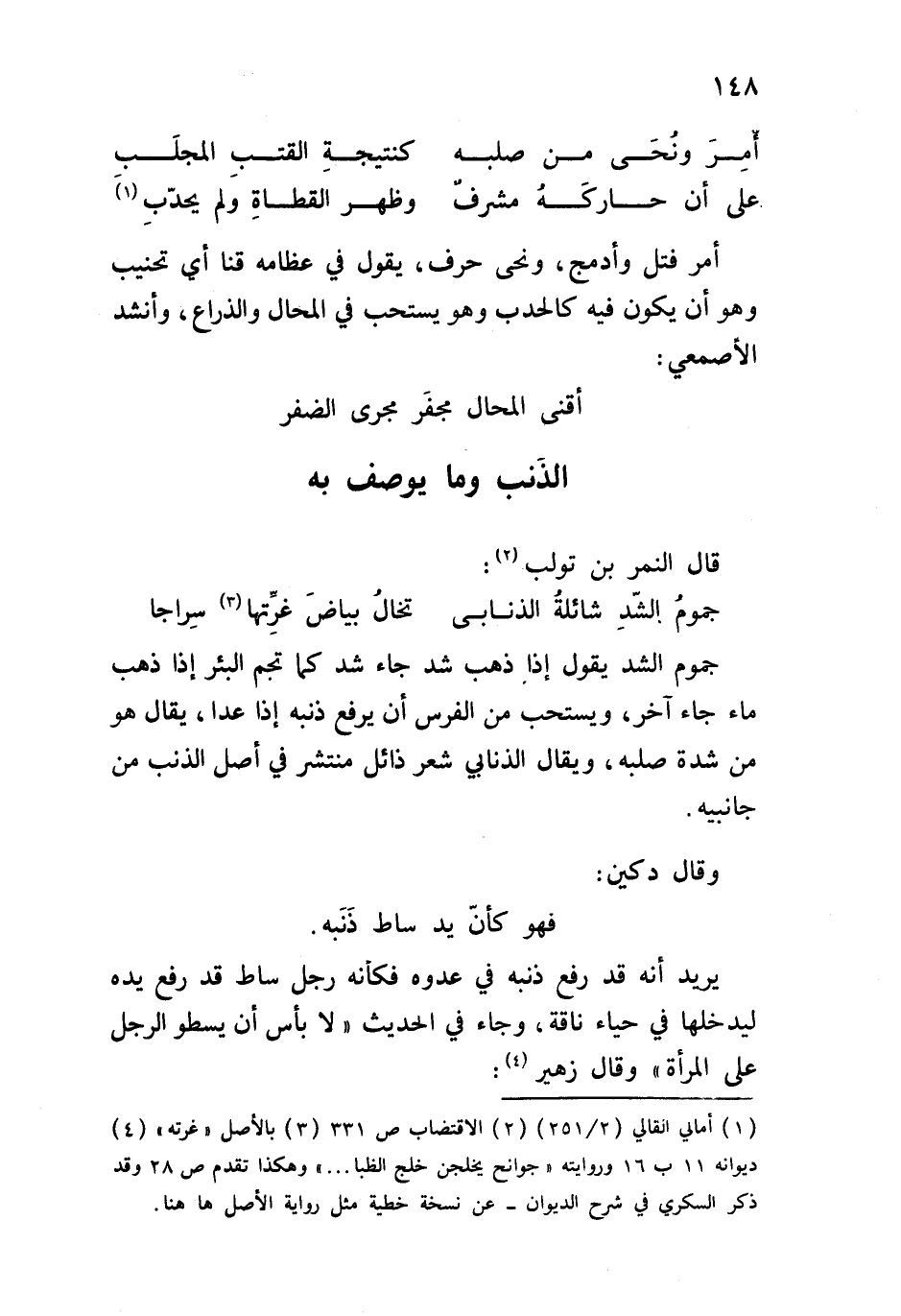 جموم الشد يقول إذا ذهب شد جاء شد كما تجم البئر إذا ذهب ماء جاء آخر، ويستحب من الفرس أن يرفع ذنبه إذا عدا، يقال هو من شدة صلبه، ويقال الذنابي شعر ذائل منتشر في أصل الذنب من جانبيه.
