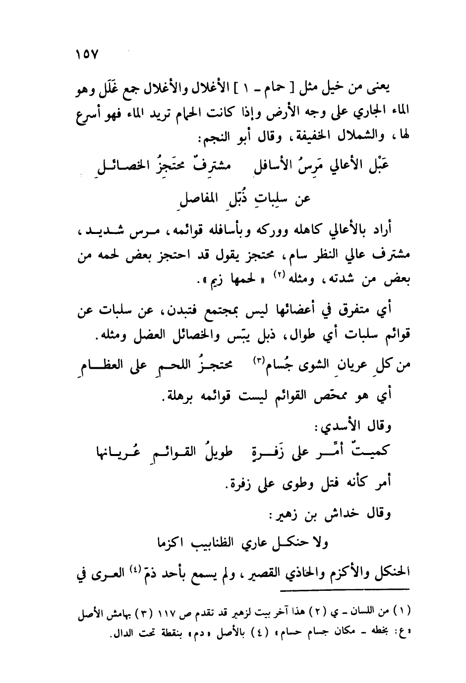 أراد بالأعالي كاهله وبأسافله قوائمه، مرس شديد، مشترف عالي النظر سام، محتجز يقول قد احتجز بعض لحمه من بعض من شدته، ومثله لحمها زيم أي مفترق في أعضائها ليس بمجتمع فتبدن، عن سلبات عن قوائم سلبات أي طوال، ذبل يبّس والخصائل العضل ومثله: