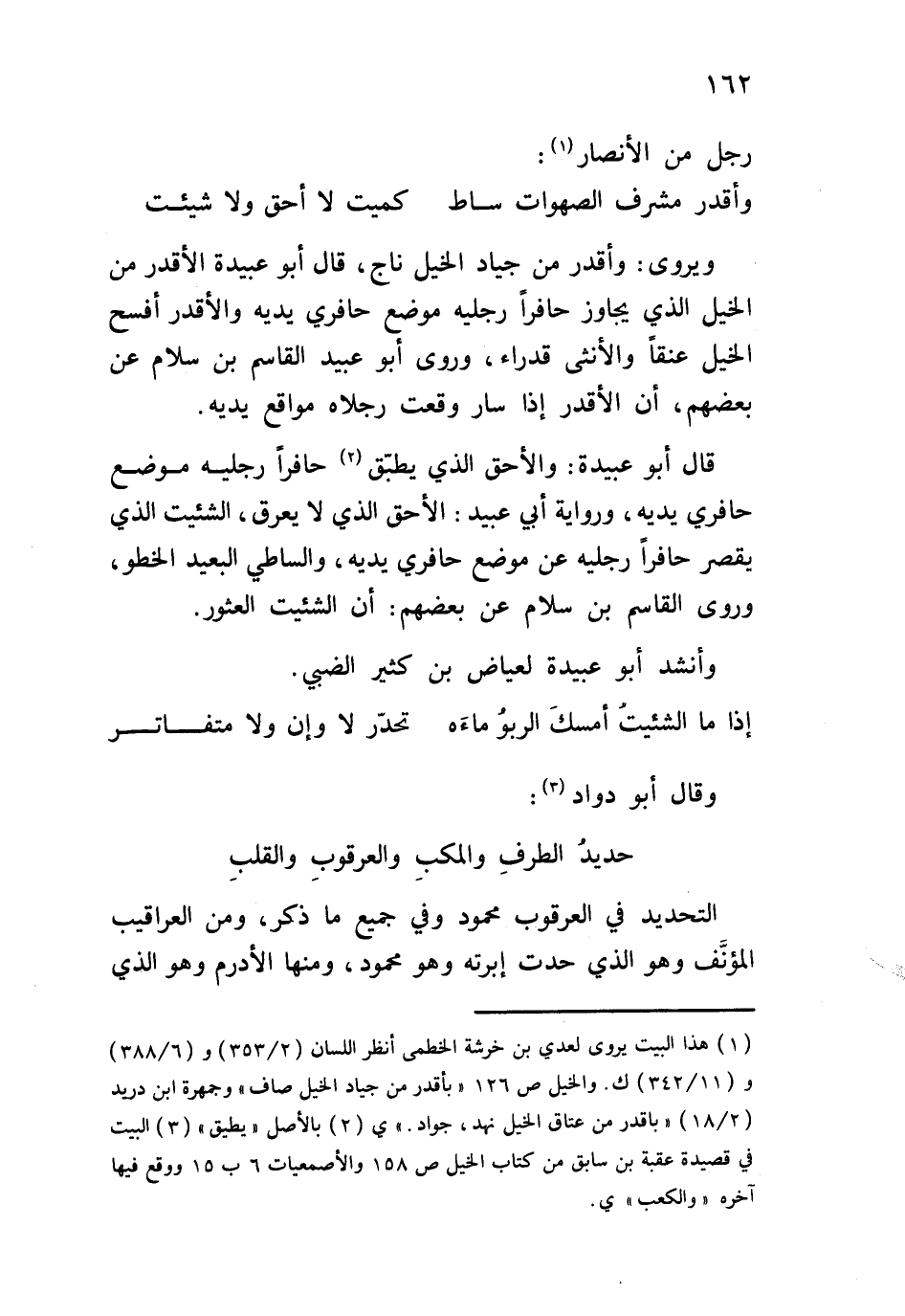 قال أبو عبيدة: والأحق الذي يطبّق حافراً رجليه موضع حافري يديه، ورواية أبي عبيد: الأحق الذي لا يعرق، الشئيت الذي يقصر حافراً رجليه عن موضع حافري يديه، والساطي البعيد الخطو، وروى القاسم بن سلام عن بعضهم: أن الشئيت العثور.