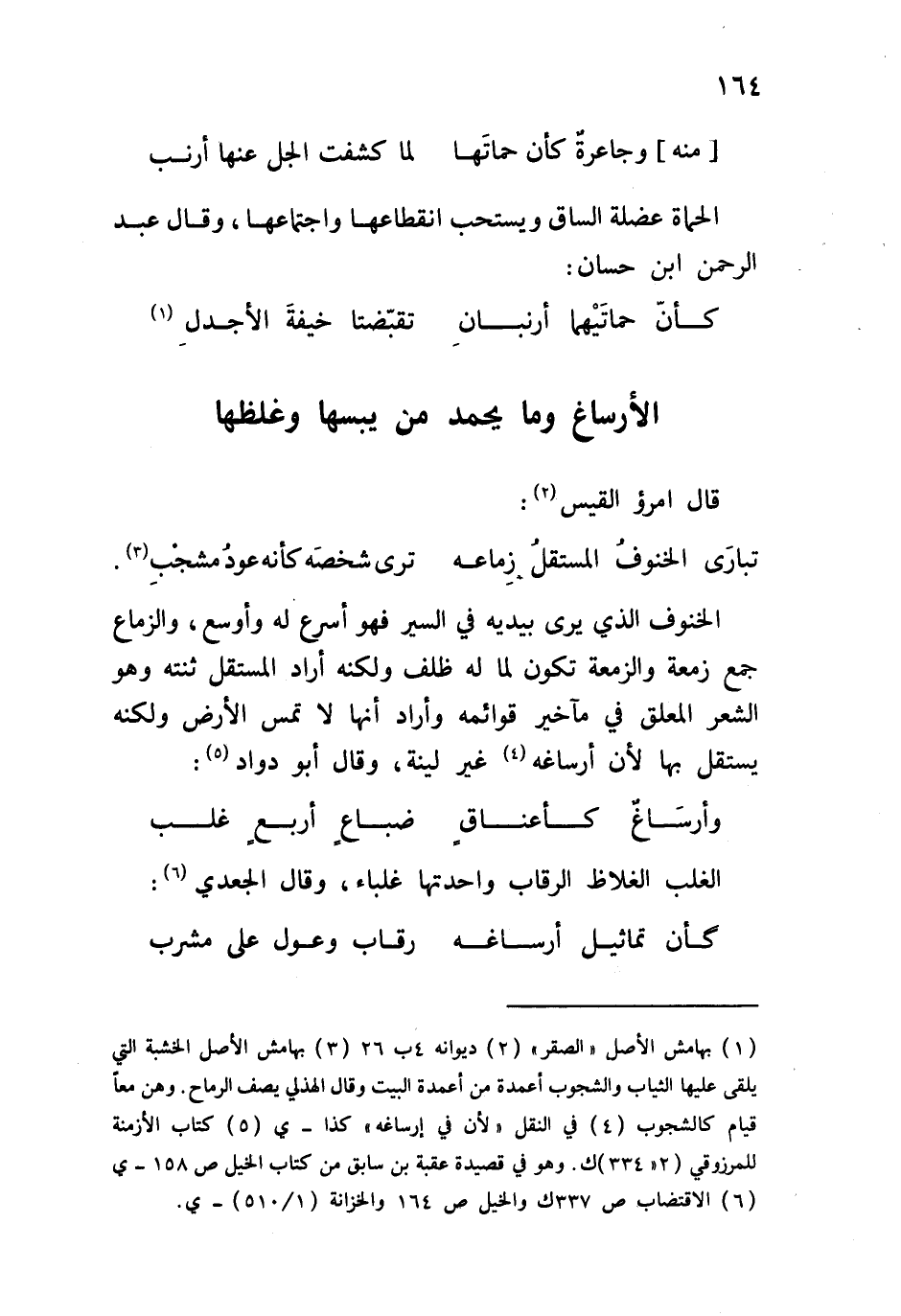 وأرساغٌ كأعناقٍ ... ضباعٍ أربعٍ غلب