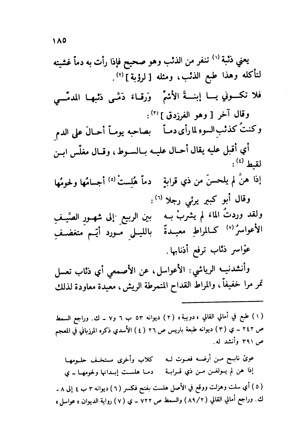 وأنشدنيه الرياشي: الأعواسل، عن الأصمعي أي ذئاب تعسل تمر مراً خفيفاً، والمراط القداح المتمرطة الريش، معيدة معاودة لذلك