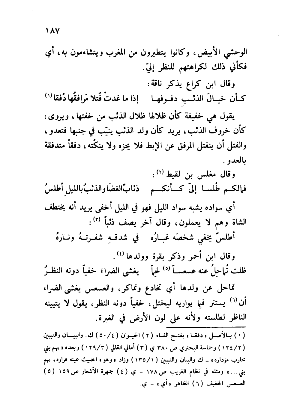 أي سواده يشبه سواد الليل فهو في الليل أخفى يريد أنه يختطف الشاة وهم لا يعملون، وقال آخر يصف ذئب: