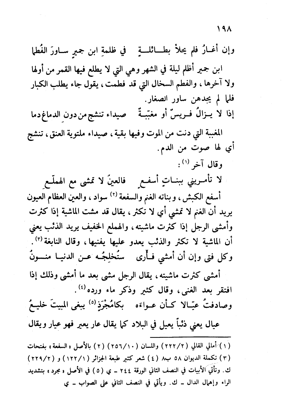 أسفع الكبش، وبناته الغنم والسفعة سواد، والعين العظام العيون يريد أن الغنم لا تمشي أي لا تكثر، يقال قد مشت الماشية إذا كثرت وأمشى الرجل إذا كثرت ماشيته، والهملع الخفيف يريد الذئب يعني أن الماشية لا تكثر والذئب يعدو عليها يفنيها، وقال النابغة: