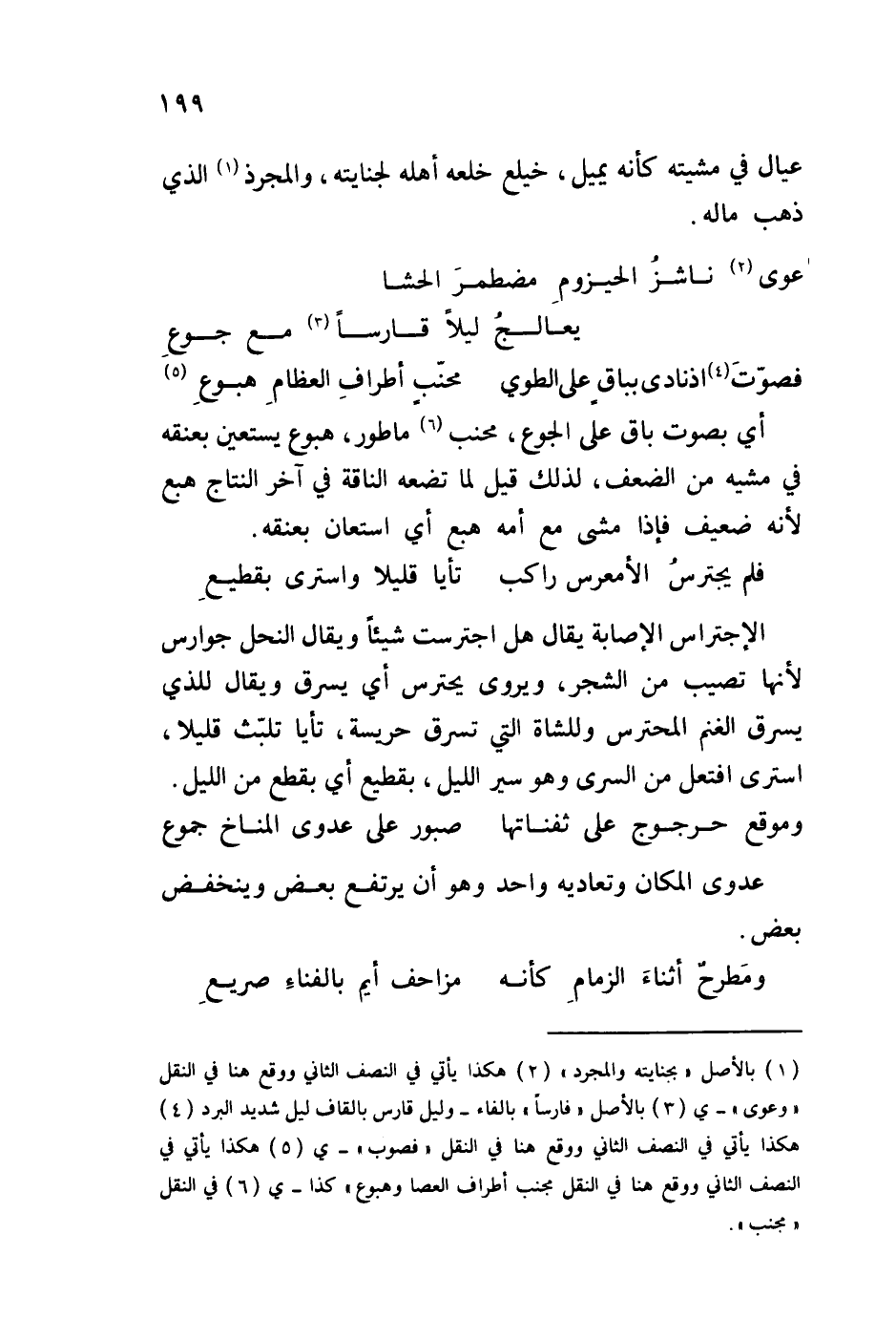 أي بصوت باق على الجوع، محنب ماطور، هبوع يستعين بعنقه في مشيته من الضعف، لذلك قيل لما تضعه الناقة في آخر النتاج هبع لأنه ضعيف فإذا مشى مع أمه هبع أي استعان بعنقه.
