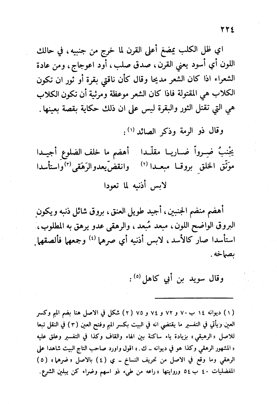 أي ظل الكلب يمضغ أعلى القرن لما خرج من جنبيه، في حالك اللون أي أسود يعني القرن، صدق صلب، أود اعوجاج، ومن عادة الشعراء إذا كان الشعر مديحاً وقال كأن ناقتي بقرة أو ثور أن تكون الكلاب هي المقتولة فإذا كان الشعر موعظة ومرثية أن تكون الكلاب هي التي تقتل الثور والبقرة ليس على أن ذلك حكاية بقصة بعينها.