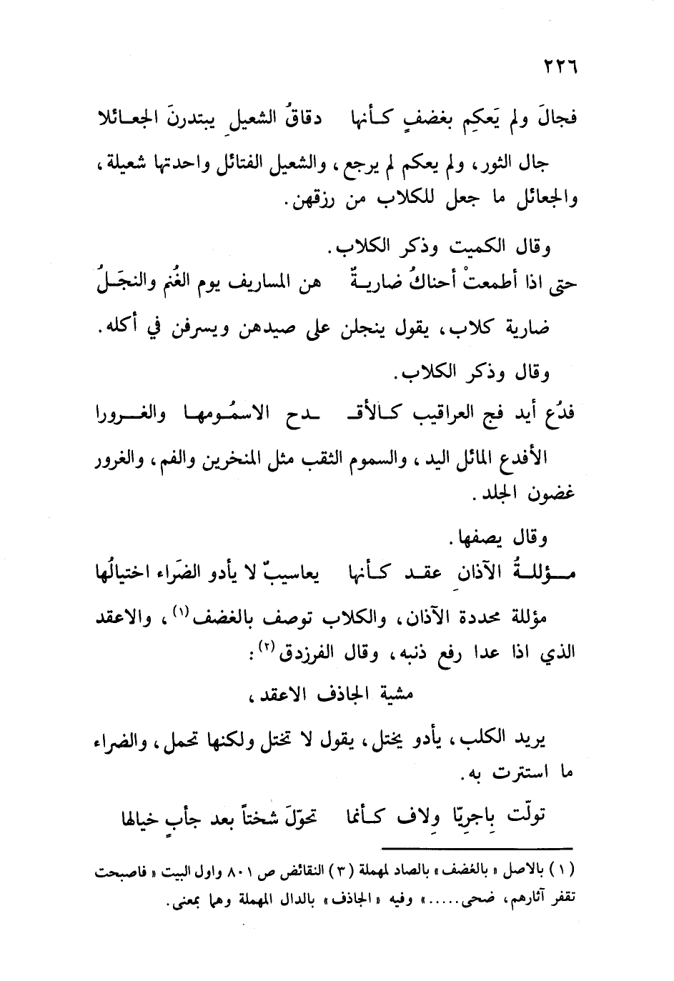 مؤللة محددة الآذان، والكلاب توصف بالغضف، والأعقد الذي إذا عدا رفع ذنبه، وقال الفرزدق: " مشية الجاذف الأعقد " يريد الكلب، يأدو يختل، يقول لا تختل ولكنها تحمل، والضراء ما استترت به.