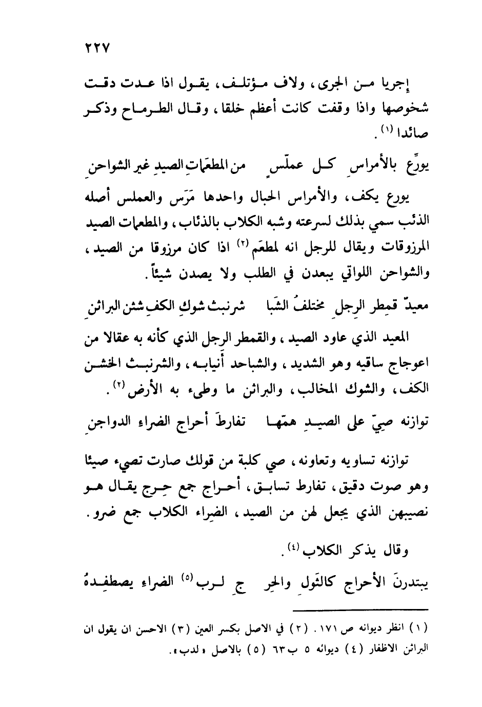 توازنه تساويه وتعاونه، صي كلبة من قولك صارت تصيء صيئاً وهو صوت دقيق، تفارط تسابق، أحراج جمع حِرج يقال هو نصيبهن الذي يجعل لهن من الصيد، الضِراء الكلاب جمع ضرو.