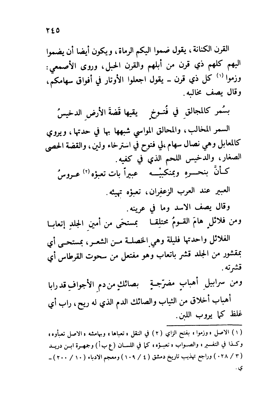 القرن الكنانة، يقول ضموا إليكم الرماة، ويكون أيضاً أن يضموا إليهم كلهم ذي قرن من أبلهم والقرن الحبل، وروى الأصمعي: وزموا كل ذي قرن - يقول اجعلوا الأوتار في أفواق سهامكم، ويقال يصف مخالبه: