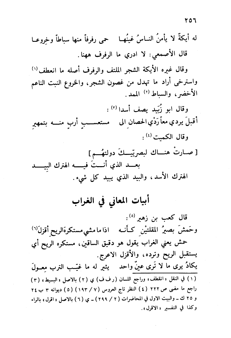 وقال غيره الأيكة الشجر الملتف والرفرف أصله ما انعطف واسترخى أراد ما تهدل من غصون الشجر، والخروع النبت الناعم الأخضر، والسباط الممد.