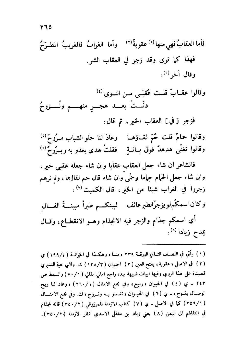 فالشاعر إن شاء جعل العقاب وإن شاء جعله عقبى خير، وإن شاء جعل الحمام حِماماً وحمَّى وإن شاء قال حم لقاؤها، ولم نرهم زجروا في الغراب شيئاً من الخير، قال الكميت:
