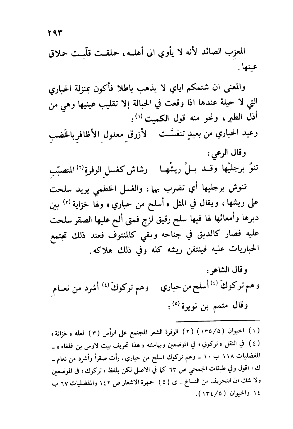 تنوشُ برجليْها أي تضرب بهما، والغسل الخطمي يريد سلحت على ريشها، ويقال في المثل " أسلح من حباري " ولها خزاية بين دبرها وأمعائها لها فيها سلح رقيق لزج فمتى ألح عليها الصقر سلحت عليه فصار كالدبق في جناحه وبقي كالمنتوف فعند ذلك تجتمع الحباريات عليه فينتفن ريشه كله وفي ذلك هلاكه.