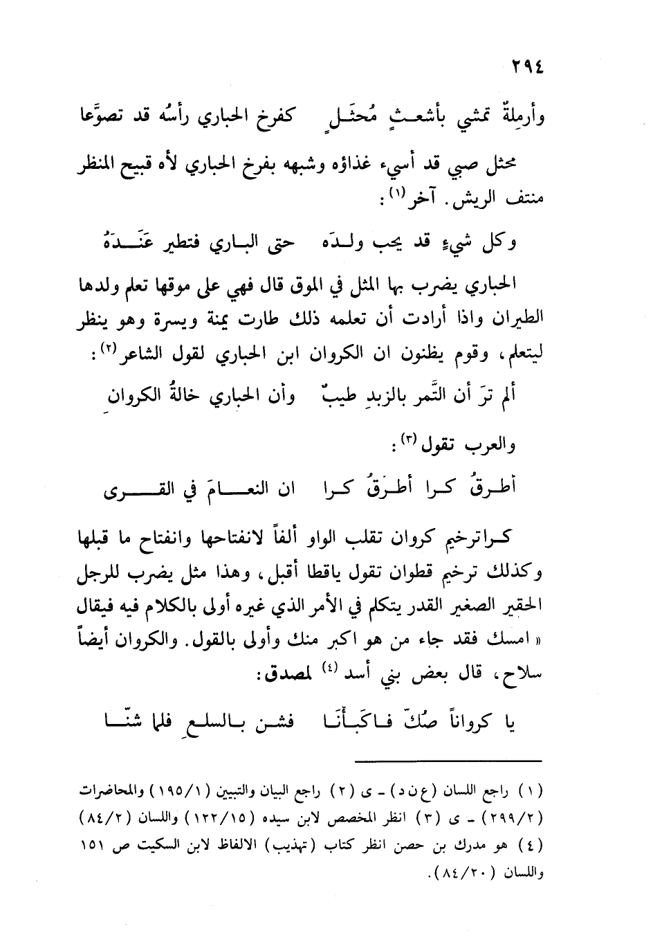كراً ترخيم كروان تقلب الواو ألفاً لانفتاحها وانفتاح ما قبلها وكذلك ترخيم قطوان تقول يا قطا أقبل، وهذا مثل يضرب للرجل الحقير الصغير القد يتكلم في الأمر الذي غيره أولى بالكلام فيه فيقال " أمسك فقد جاء من هو أكبر منك وأولى بالقول " والكروان أيضاً سلاح، قال بعض بن أسد لمصدق: