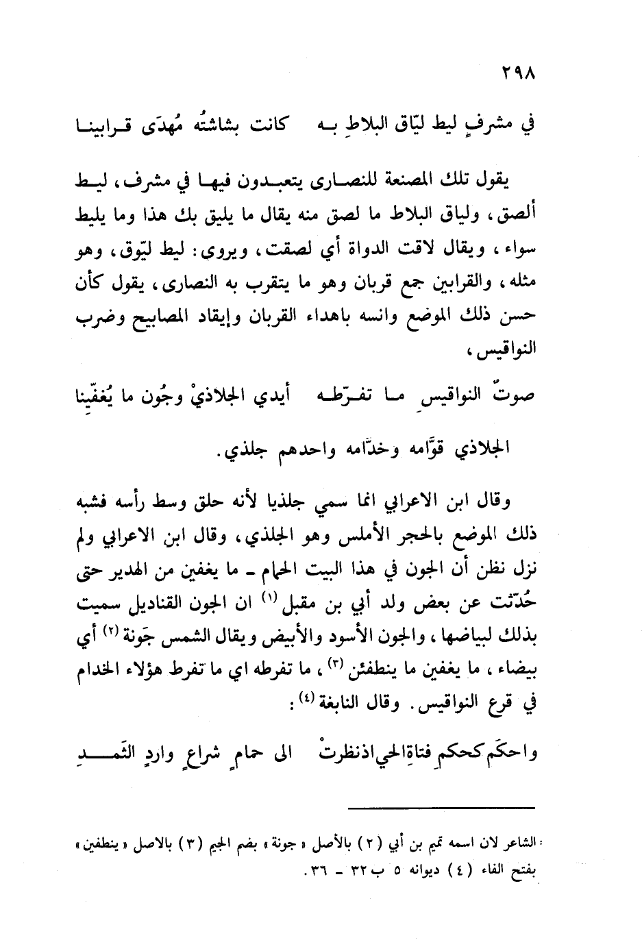 وقال ابن الأعرابي إنما سمي جلذياً لأنه حلق وسط رأسه فشبه ذلك الموضع بالحجر الأملس وهو الجلذي، وقال ابن الأعرابي ولم نزل نظن أن الجون في هذا البيت الحمام - وما يغفين من الهدير حتى حُدّثت عن بعض ولد أبي بن مقبل أن الجون القناديل سميت بذلك لبياضها، والجون الأسود والأبيض ويقال الشمس جَونة أي بيضاء، ما يغفين ما ينطفئن، ما تفرطه أي ما تفرط هؤلاء الخدام في قرع النواقيس. وقال النابغة: