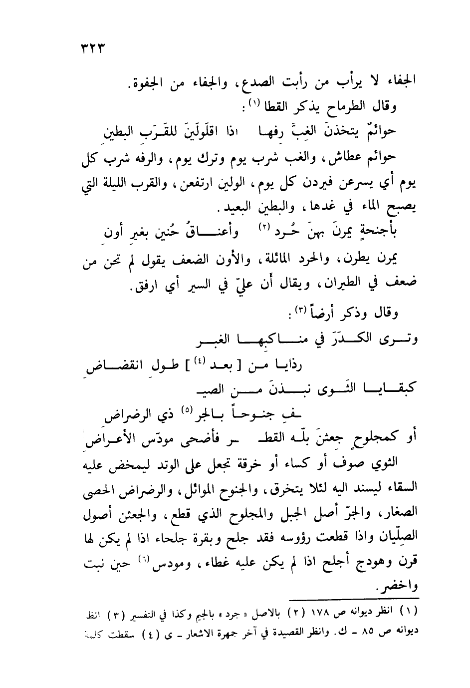 الثوي صوف أو كساء أو خرقة تجعل على الوتد ليمخض عليه السقاء ليسند إليه لئلا يتخرق، والجنوح الموائل، والرضراض الحصى الصغار، والجرّ أصل الجبل والمجلوح الذي قطع، والجعثن أصول الصِليان وإذا قطعت رؤوسه فقد جلح وبقرة جلحاء إذا لم يكن لها قرن وهودج أجلح إذا لم يكن عليه غطاء، ومودس حين نبت واخضر.