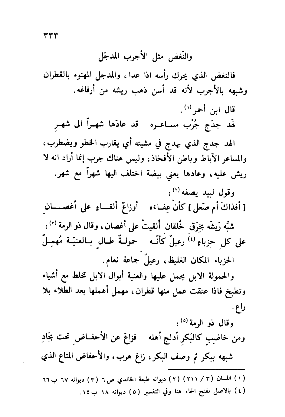 فالنغض الذي يحرك رأسه إذا عدا، والمدجل المهنوء بالقطران وشبهه بالأجرب لأنه قد أسن ذهب ريشه من أرفاغه.