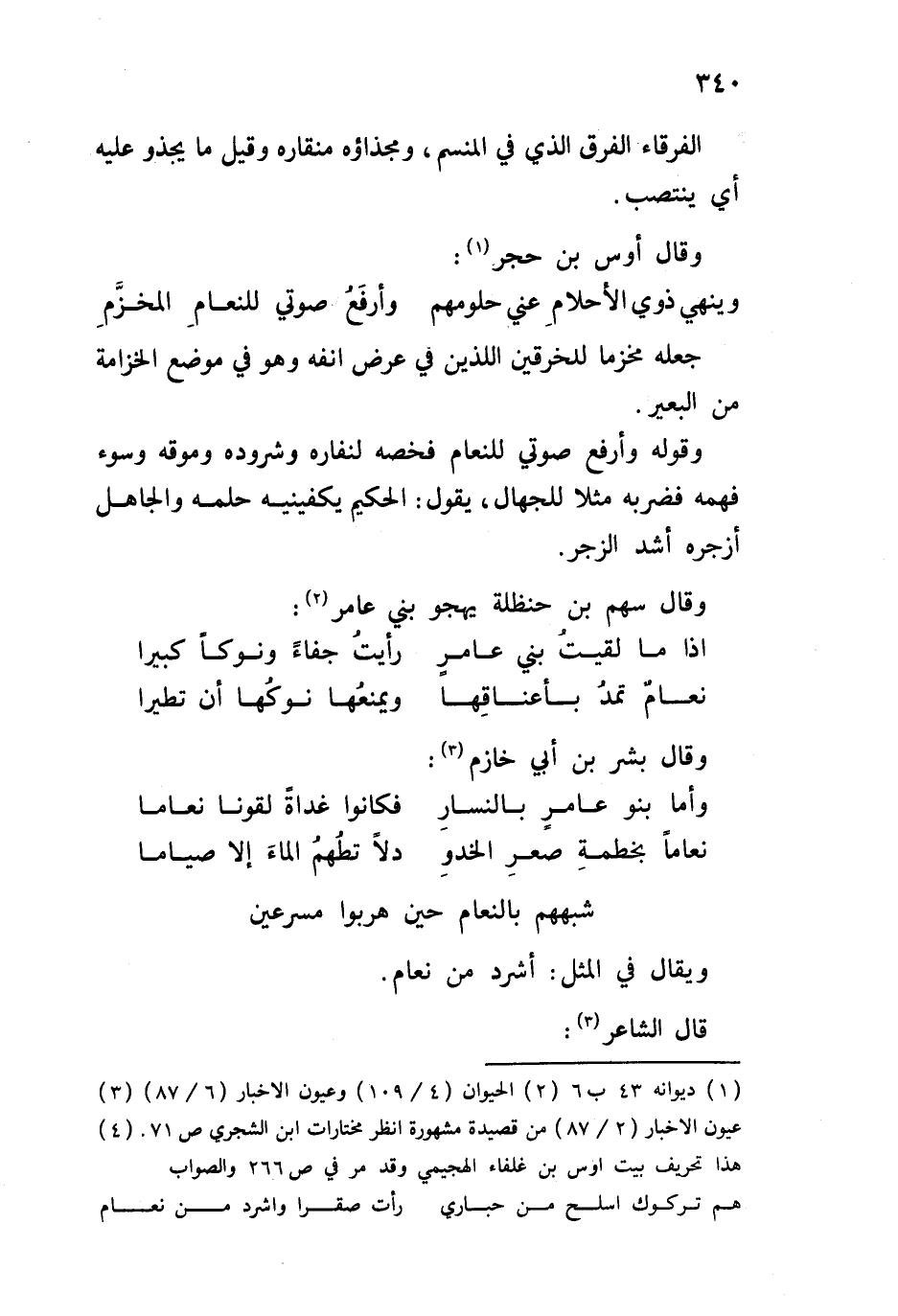 وقوله أرفع صوتي للنعام فخصه لنفاره وشروده وموقه وسوء فهمه فضربه مثلاً للجهال، يقول: الحكيم يكفينيه حلمه والجاهل أزجره أشد الزجر.