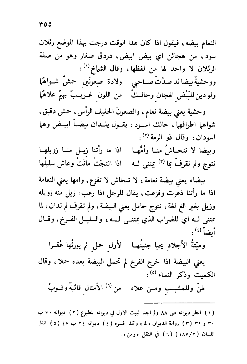 وحشية يعني بيضة نعام، والصعون الخفيف الرأس، حمش دقيق، شواهما أطرافهما، حالك أسود، يقول يلدان بيضاً أبيض وهما أسودان، وقال ذو الرمة:
