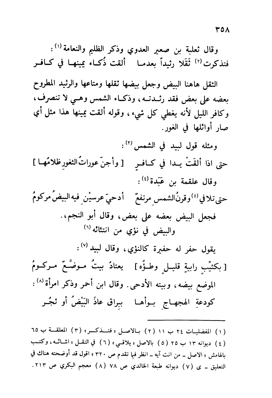 الثقل هاهنا البيض وجعل بيضها ثقلها ومتاعها والرثيد المطروح بعضه على بعض فقد رثدته، وذكاء الشمس وهي لا تنصرف، وكافر الليل لأنه يغطي كل شيء، وقوله ألقت يمينها هذا مثل أي صار أوائلها في الغور.