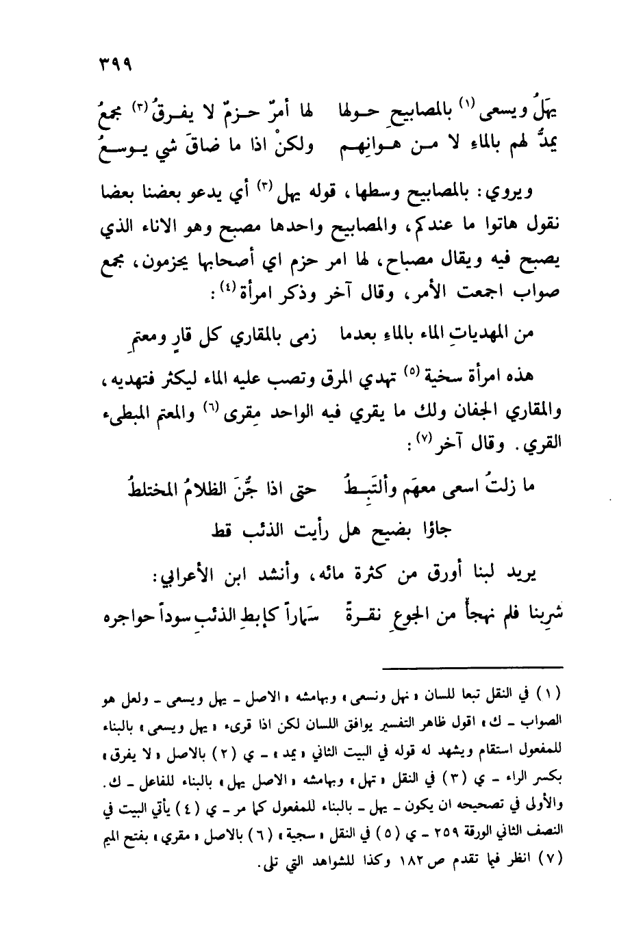 ويروي: بالمصابيح وسطها، قوله يهل أي يدعو بعضنا بعضاً نقول هاتوا ما عندكم، والمصابيح واحدها مصبح وهو الإناء الذي يصبح فيه ويقال مصباح، لها أمر حزم أي أصحابها يحزمون، مجمع صواب أجمعت الأمر، وقال آخر وذكر امرأة: