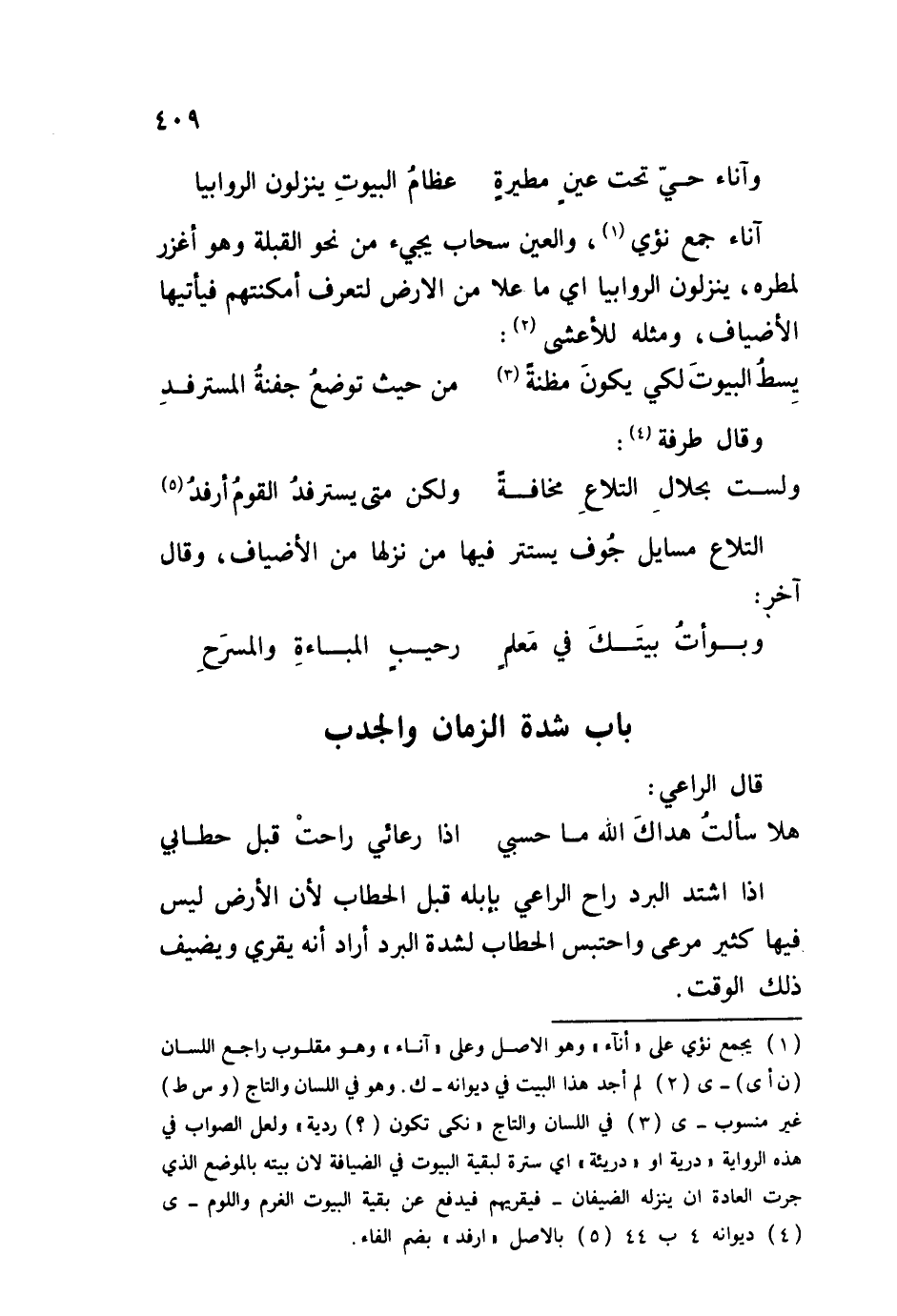 آناء جمع نؤي، والعين سحاب يجيء من نحو القبلة وهو أغزر لمطره، ينزلون الراوبيا أي ما علا من الأرض لتعرف أمكنتهم فيأتيها الأضياف، ومثله للأعشى: