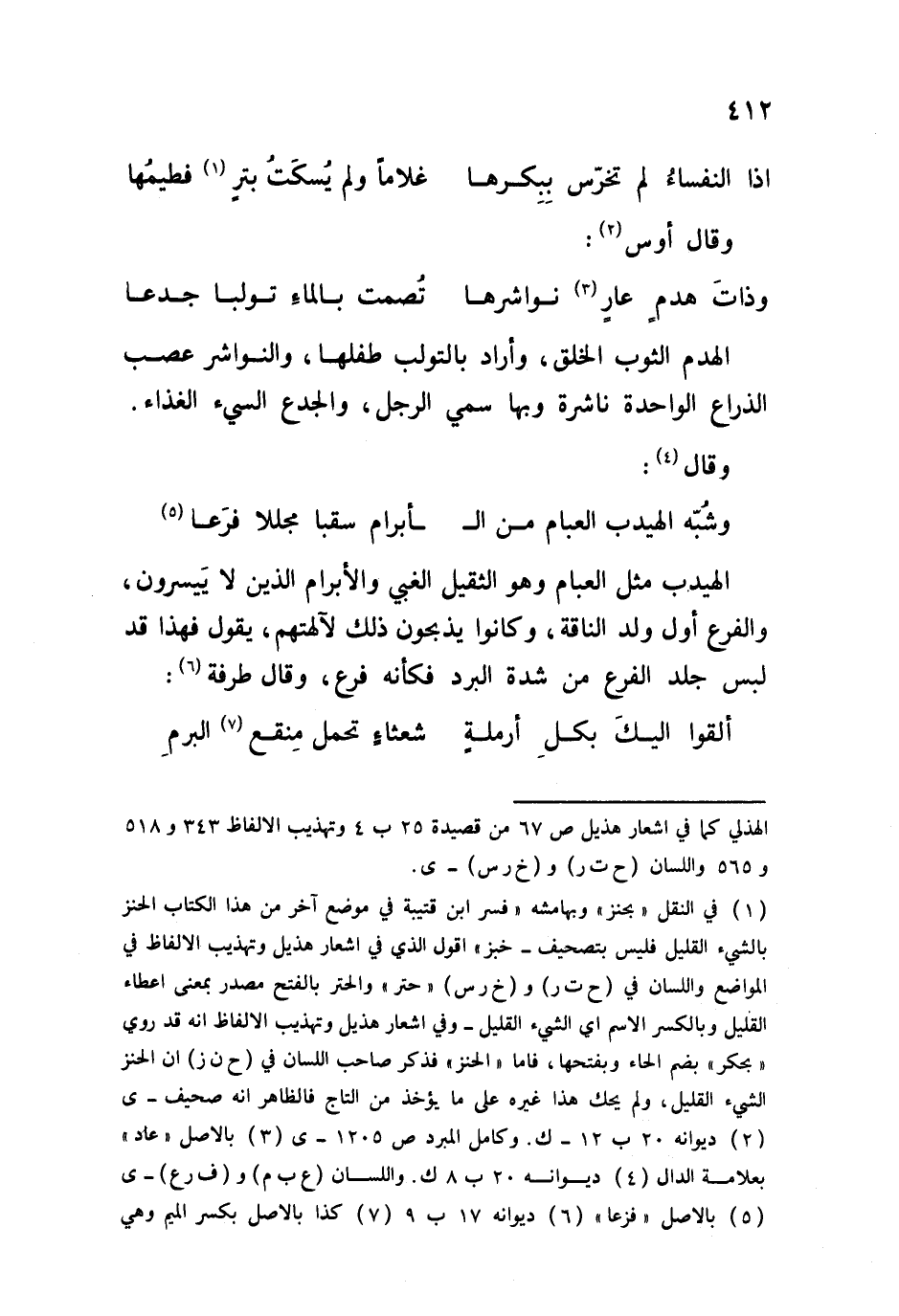 الهيدب مثل العبام وهو الثقيل الغبي والأبرام الذين لا ييسرون، والفرع أول ولد الناقة، وكانوا يذبحون ذلك لآلهتهم، يقول فهذا قد لبس جلد الفرع من شدة البرد فكأنه فرع، وقال طرفة: