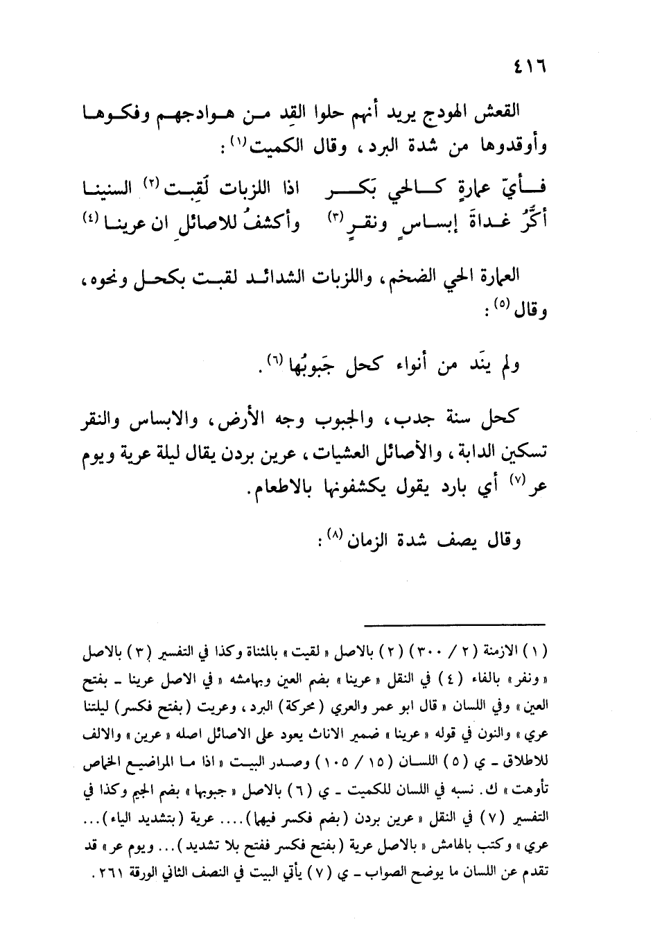 كحل سنة جدب، والجبوب وجه الأرض، والإبساس والنقر تسكين الدابة، والأصائل العشيات، عرين بردن يقال ليلة عرية ويوم عر أي بارد يقول يكشفونها بالإطعام.